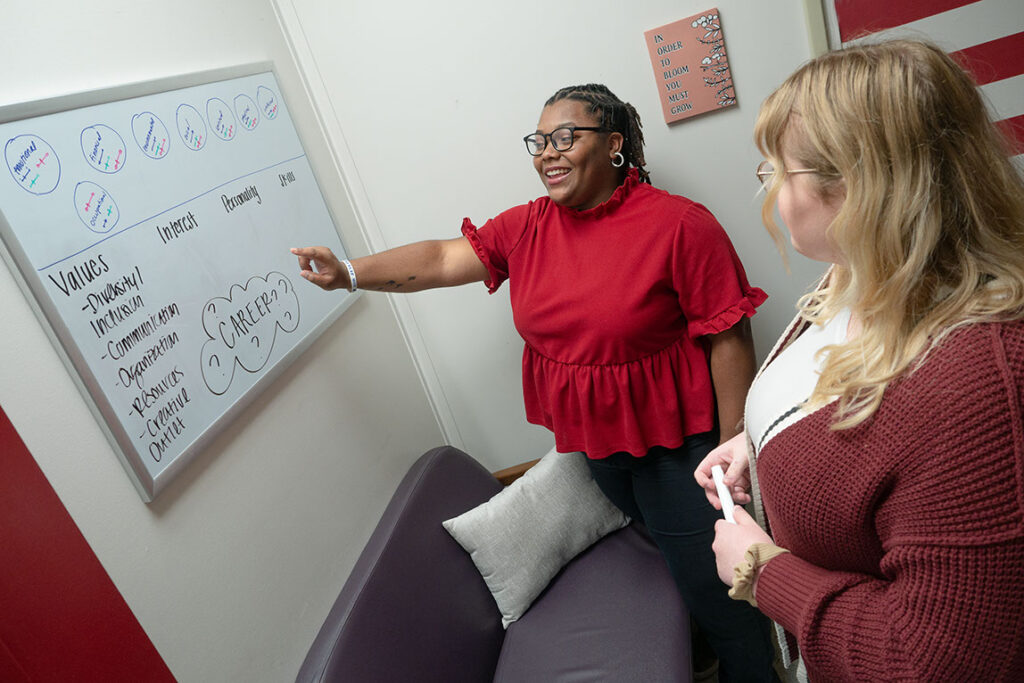 Career Services staffer Anneka Scott (L) working with student Laura Ryle (R)